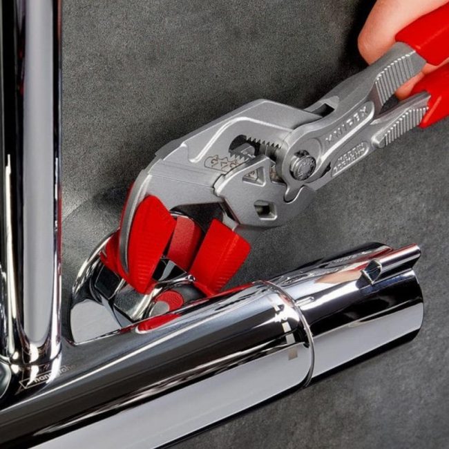 The Knipex 86 03 Series Pliers Wrench with dipped PVC handles and smooth parallel jaws for cautious installation of plated fittings or sensitive surfaces. More effective, faster and greater capacity than an adjustable spanner of the same size.