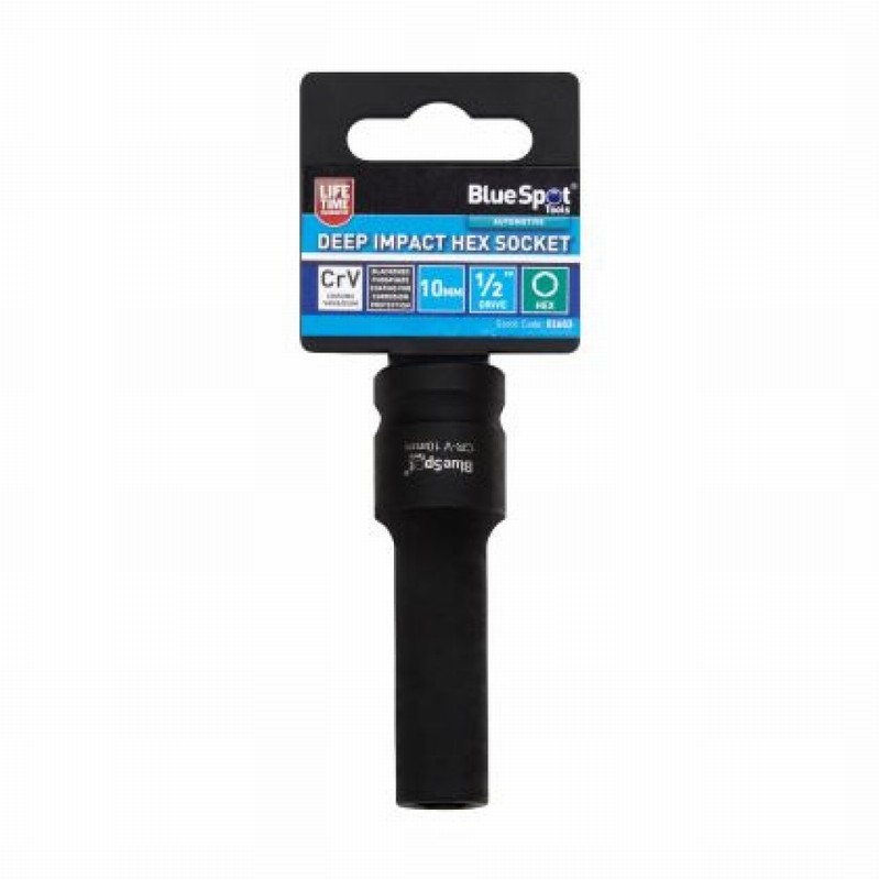 The Blue Spot Tools Individual Deep Impact Hex Socket (10mm) is manufactured from chrome vanadium for increased durability.