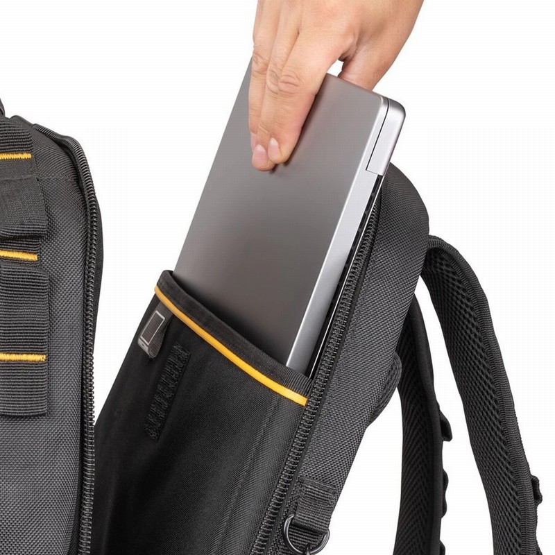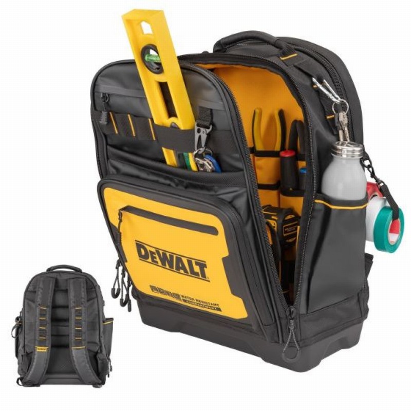 The DEWALT DWST60102 Pro Backpack has 43 various pockets. Everything has its place thanks to dedicated compartments for bottles, tools, drills, and batteries. An IP54 water-resistant welded compartment provides safe storage for important items. Made from high-quality, dirt repellent 1680D fabric. With re-enforced stitching to increase durability and hold its shape over time.