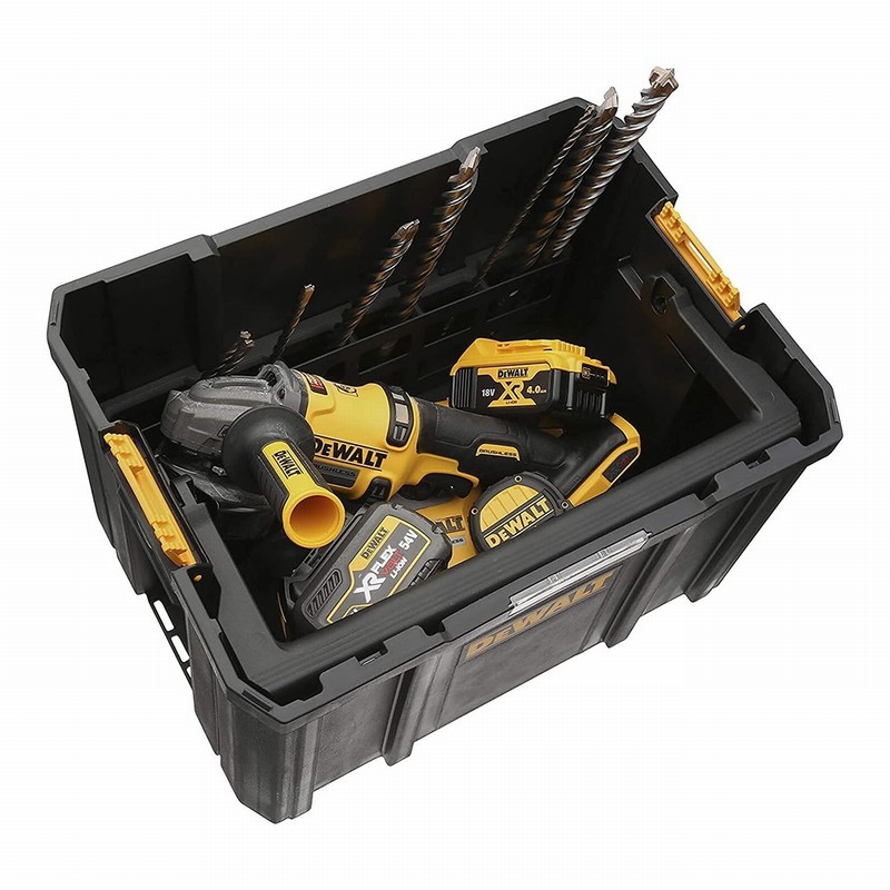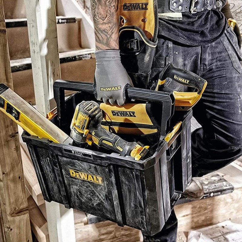 The DEWALT TSTAK Tote is a tough, durable tool case made from 3mm polypropylene plastic. With a large open interior for bulk storage and vertical tool storage for easy visibility access to frequently used tools. It also features nameplates for easy content identification and an ergonomic carry handle.