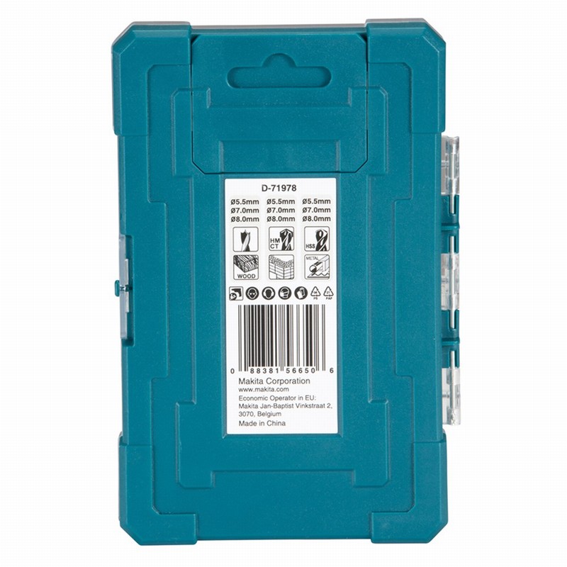 The Makita D-71978 drill bit set is suitable for drilling metal, masonry and wood. The D-71978 contains 3 brad point drill bits for wood, 5.5mm, 7mm and 8mm diameter, 3 HSS drill bits for metal, 5.5mm, 7mm and 8mm diameter and 3 TCT drill bits for masonry, 5.5mm, 7mm and 8mm diameter. Supplied in a plastic case with transparent front for easy identification of the bits.