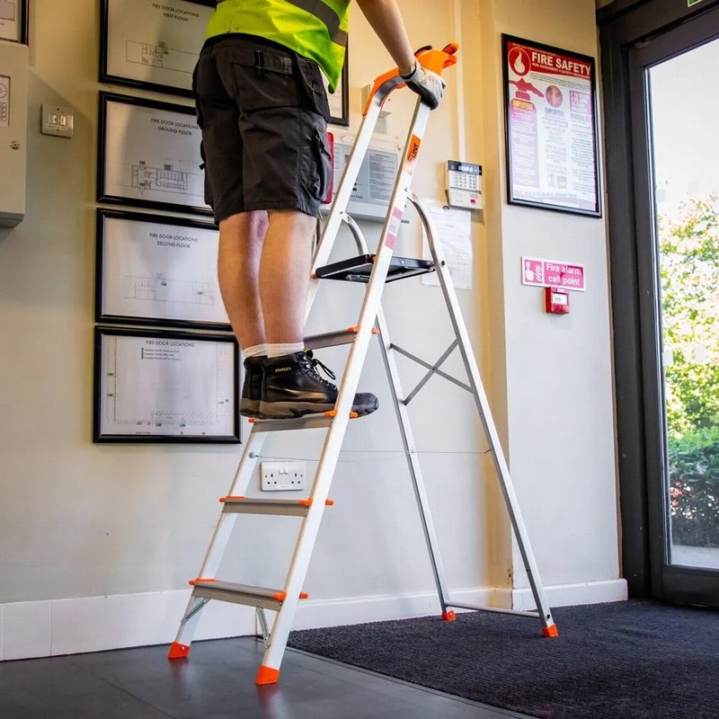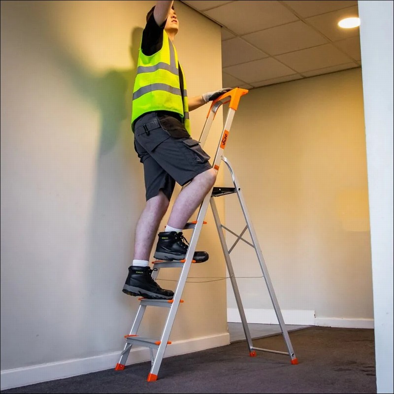 The Vaunt 5 tread step ladder offers you a quick and simple ladder solution to your working at height requirements! The ladder opens with ease and the top work step locks securely to the frame to ensure the ladder is secure and safe when in use. Simply release the lock with the easily accessible release catch to fold the ladder closed. The ladder feet themselves have a slip resistant base and the extra long hand rail includes a handy tool & accessory caddy/tray, ideal for when you are working at height and need to put things down. Made of very strong aluminium with additional rust resistant coating, the ladder is durable to withstand the demands of a typical construction site, yet light enough to carry around comfortably. The extra wide welded foot treads provide a stable footing to stand on and feels comfortable when standing for prolonged periods of time. With the max load of 150kg, this ladder meets all the requirements to pass as EN131 PROFESSIONAL standard, meaning it qualifies for both home and site use.